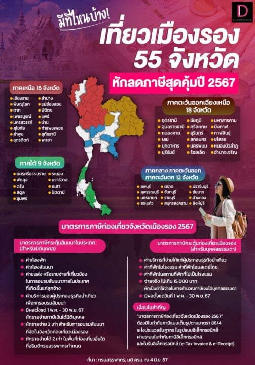 เปิดมาตรการลดภาษีท่องเที่ยว "เมืองรอง 55 จังหวัด" มีที่ไหนบ้าง เช็กเงื่อนไขหักลดหย่อนภาษีสุดคุ้ม ทั้งนิติบุคคล จ่ายค่าธุรกิจนำเที่ยว อบรมสัมมนา 2 เท่า และบุคคลธรรมดาสูงสุด 15,000 บาท ระหว่างวันที่ 1 พฤษภาคม-30 พฤศจิกายน 2567