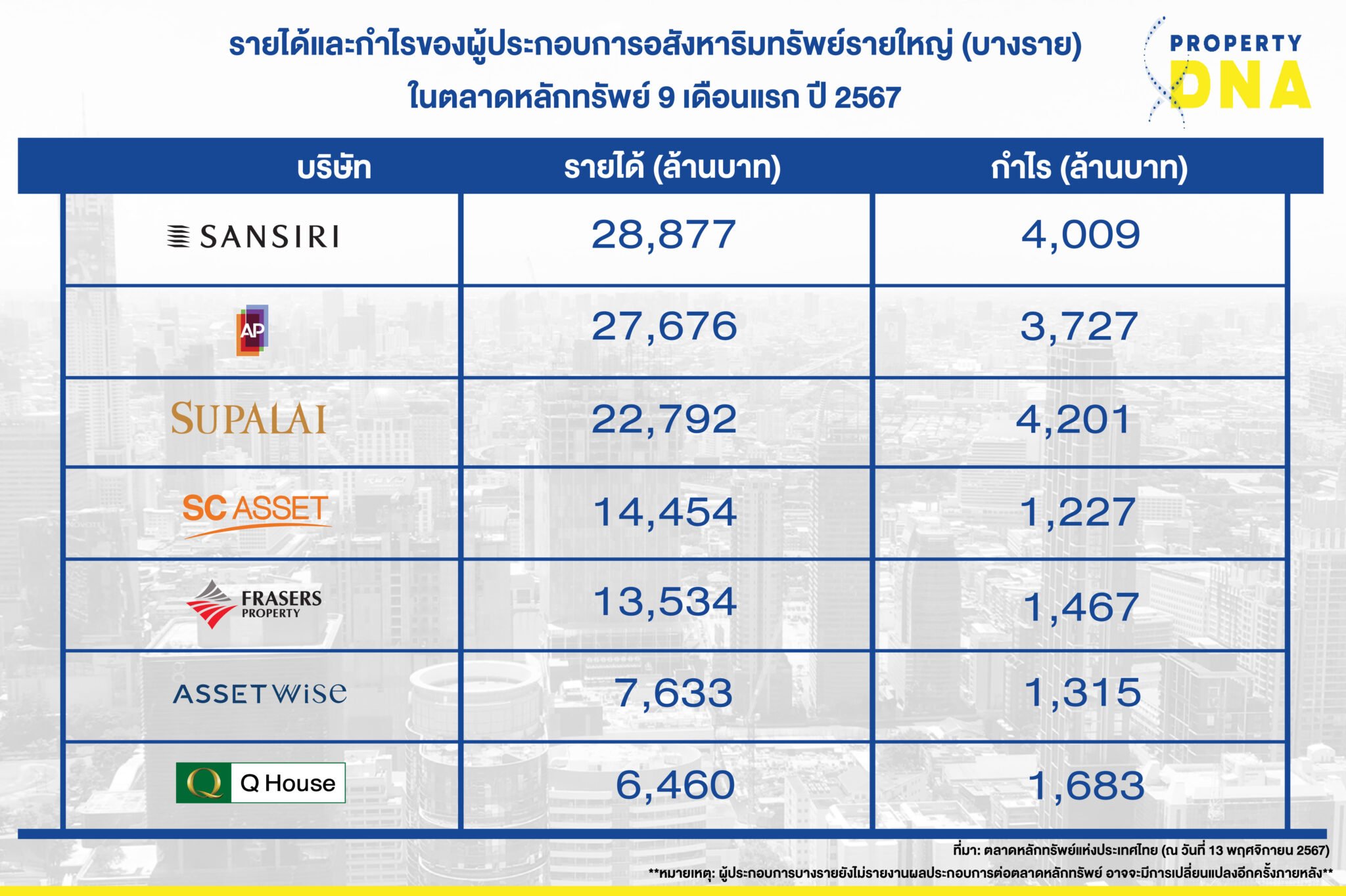 เปิดรายได้-กำไร 9 เดือน 7 บิ๊กอสังหาฯ ‘แสนสิริ’ รายได้นำโด่ง 2.8 หมื่นล้านบาท